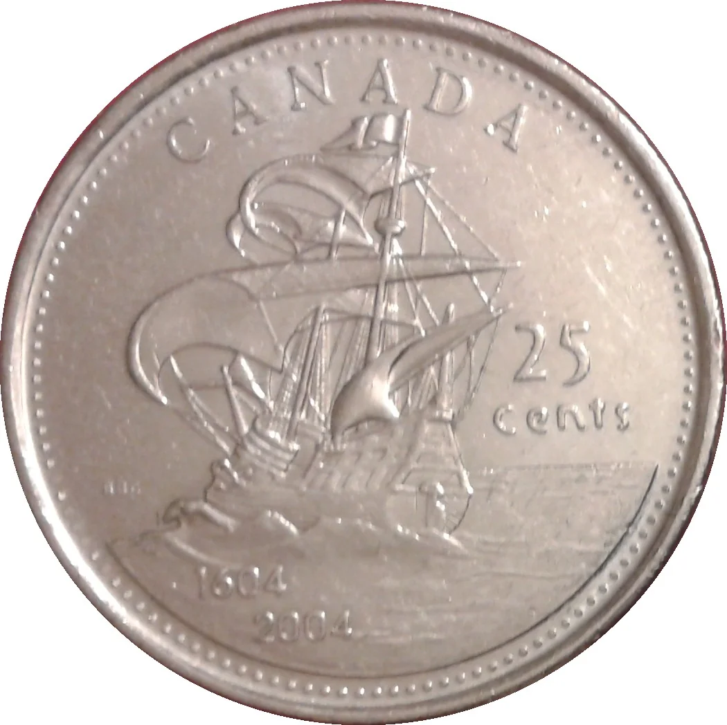 A 17th-century ship encircled by the value, with "1604-2004" and the country name above.