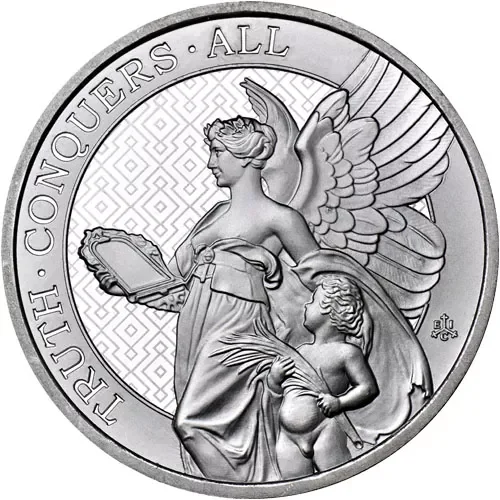 Truth in left-profile relief holds a mirror and comforts a child, who holds a palm branch.