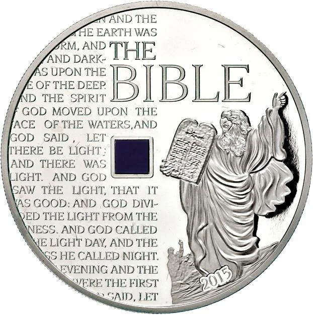 Description: The reverse features Moses with the Ten Commandments. A biblical passage appears at left, while a central Nano-Chip contains the entire Old and New Testaments. "The Bible" is inscribed at the top, with the issue year "2015" at the bottom.