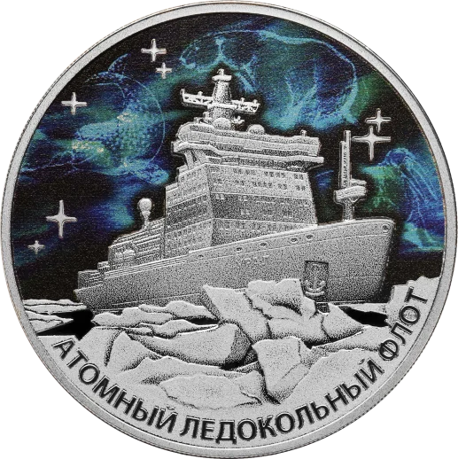 The mirror disc features relief images of the icebreaker 'Ural', rubble ice, and stars over colored polar lights, with the rim inscription: ‘АТОМНЫЙ ЛЕДОКОЛЬНЫЙ ФЛОТ’.
