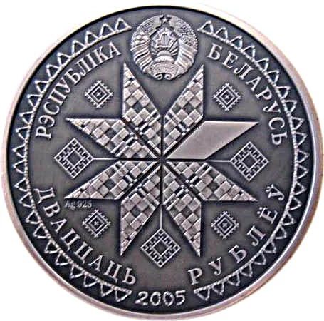 Description: The circular ornament features the relief of the State Coat of Arms. At its center is a solar sign—an octagonal figure with rhombic decor representing rays. Below is the year of issue and silver alloy standard. The rim is inscribed "РЭСПУБЛIКА БЕЛАРУСЬ" above and "ДВАЦЦАЦЬ РУБЛЁЎ" below.