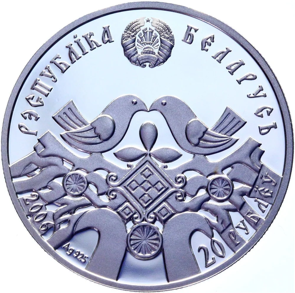 Below: Year, alloy standard, and face value "20 РУБЛЁЎ".
