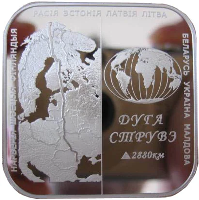 Description: Left: A relief map of Europe showing the Struve Geodetic Arc. Right: A world map with the inscription "The Struve Geodetic Arc and its extent – 2880 km" below. Around the coin's perimeter: NORWAY, SWEDEN, FINLAND, ESTONIA, LATVIA, LITHUANIA, UKRAINE, MOLDOVA.