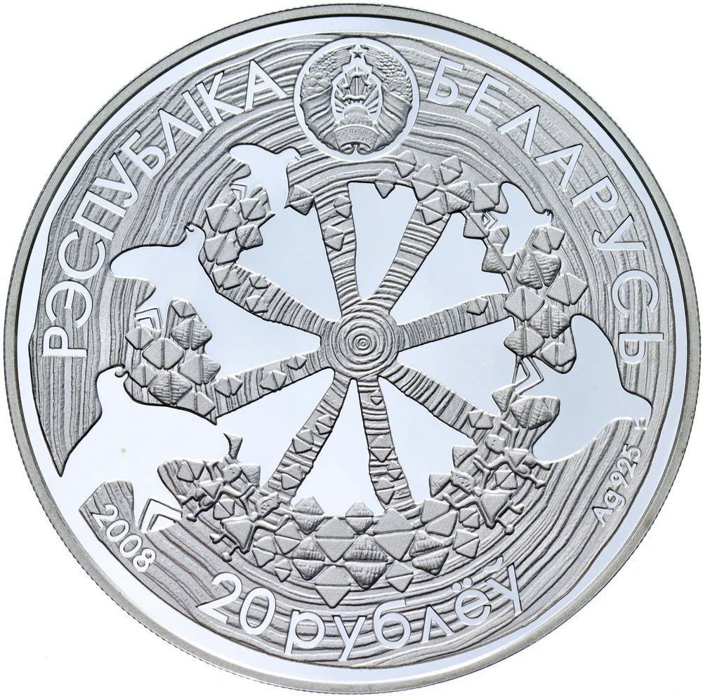 Reverse: Stylized cuckoo silhouettes and national ornament against a spinning wheel transforming into tree rings. Below: year, alloy, and circumferential inscriptions "РЭСПУБЛІКА БЕЛАРУСЬ" and "20 РУБЛЁЎ".