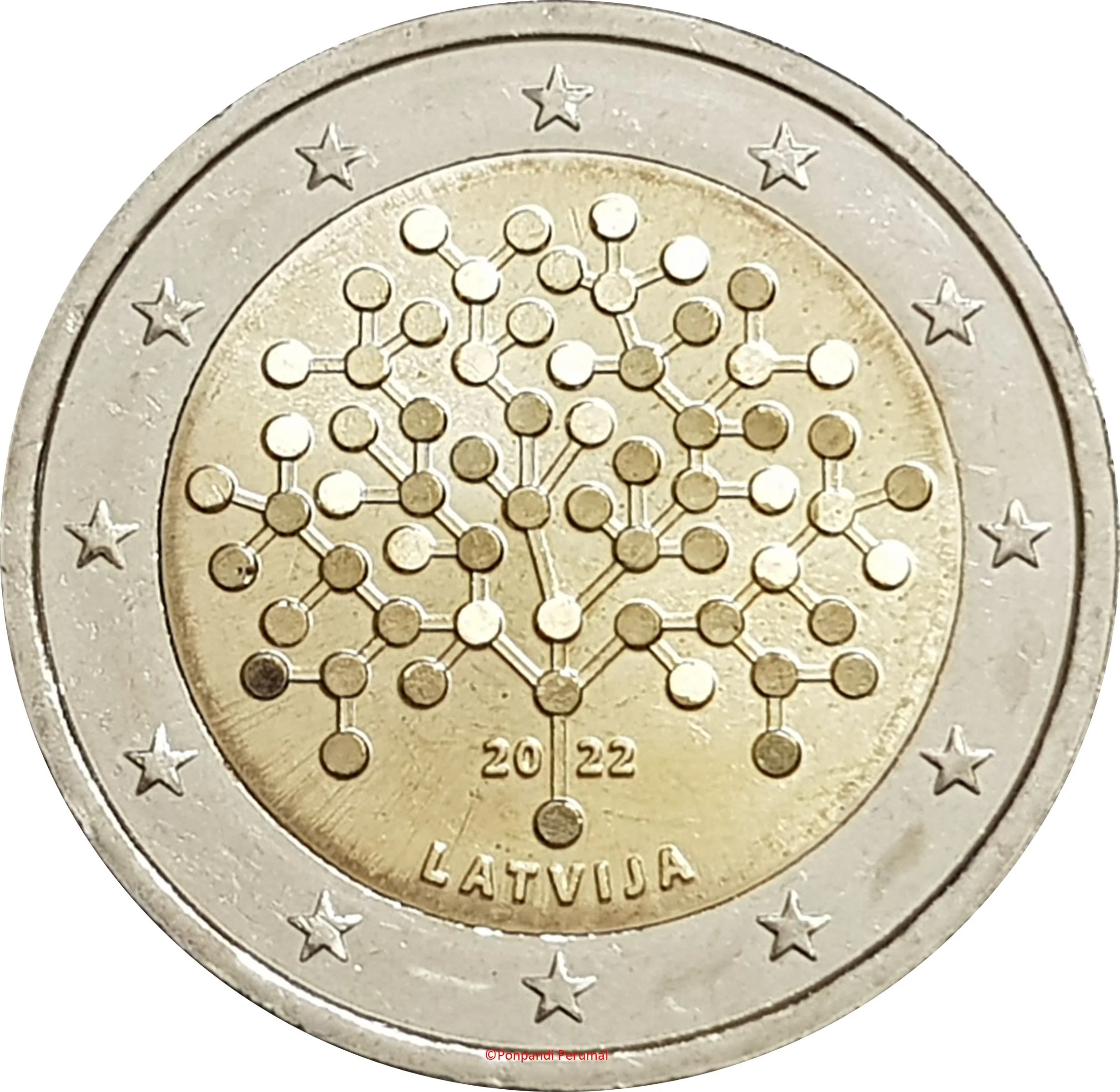 Financial literacy is the ability to understand and use skills like budgeting and investing. It is the foundation of our relationship with money. The design features a tree symbolizing this knowledge, the year '2022', the issuing country 'LATVIJA', and the 12 stars of the European flag.