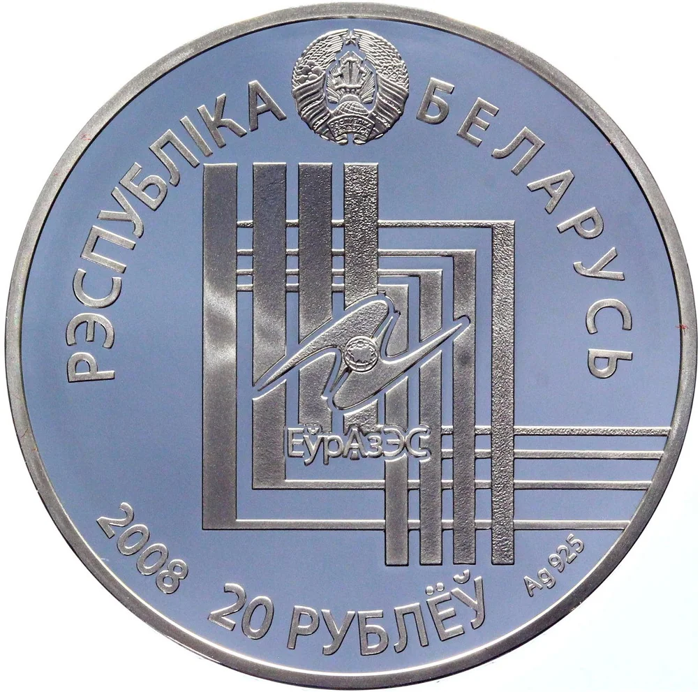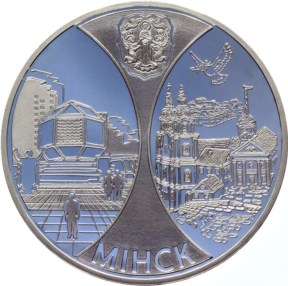Description: The right semicircle shows historic city buildings, a dove, and Troitskoye district. The left semicircle features modern residences, the National Library, people, and a monument to F. Skorina. The top displays the Minsk coat of arms, with "МІНСК (MINSK)" below.