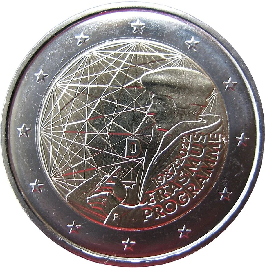 The design combines a portrait of Erasmus with a network of connecting beams, symbolizing the programme’s intellectual exchanges across Europe. Emerging stars from these links form the contemporary number 35, marking the anniversary. The outer ring features the twelve stars of the European flag.