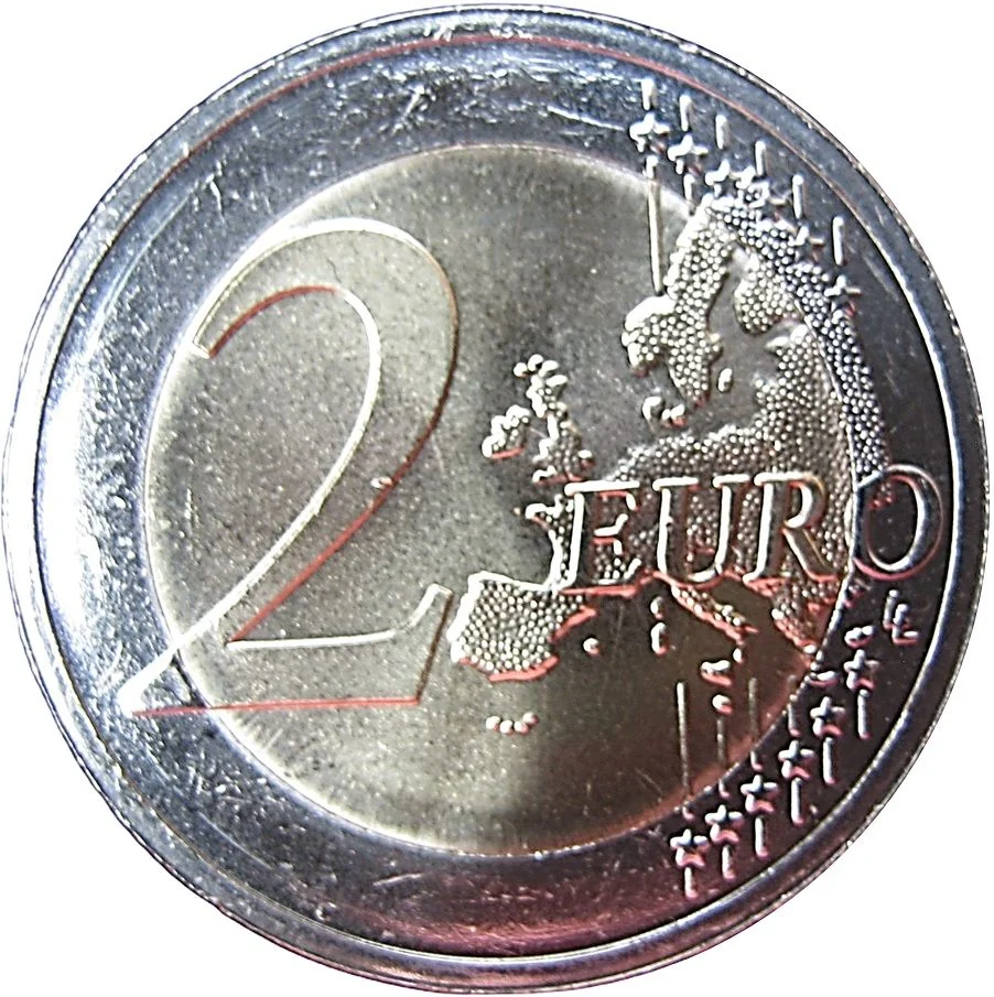A Western Europe map spans the coin's right side, with "2 EURO" overlaid—the "2" in the Atlantic. Twelve stars flank the map, six above and six below, connected by six vertical stripes across the inner core.