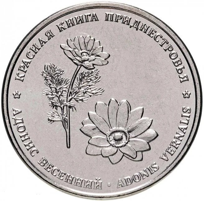 The light yellow spring Adonis, a medically approved and decorative plant, is featured on the coin's reverse as both a sprout and a detailed flower, labeled with its Latin name.