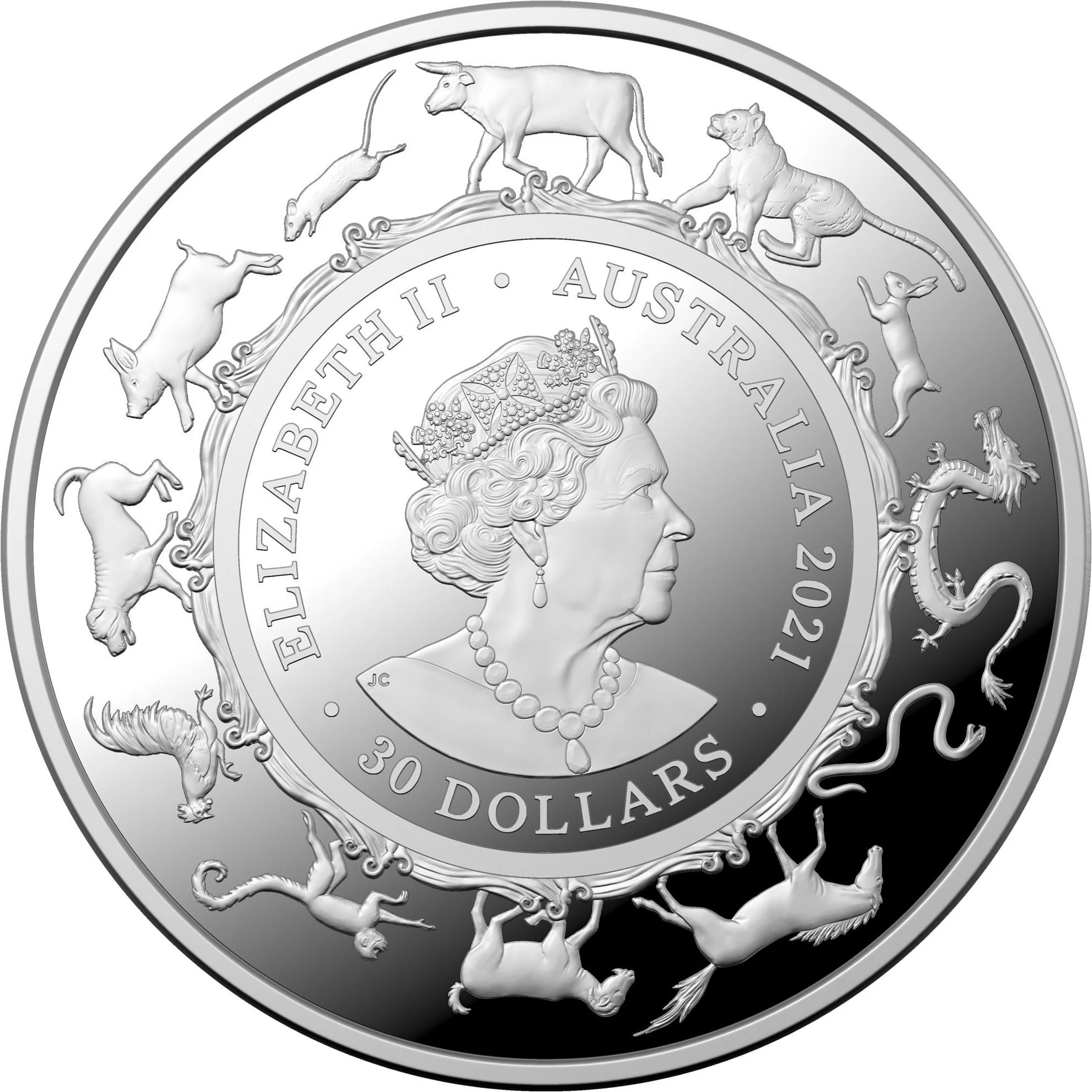 Queen Elizabeth VI in profile, wearing the George IV State Diadem and Victorian Coronation Necklace, encircled by the 12 Chinese Zodiac signs.