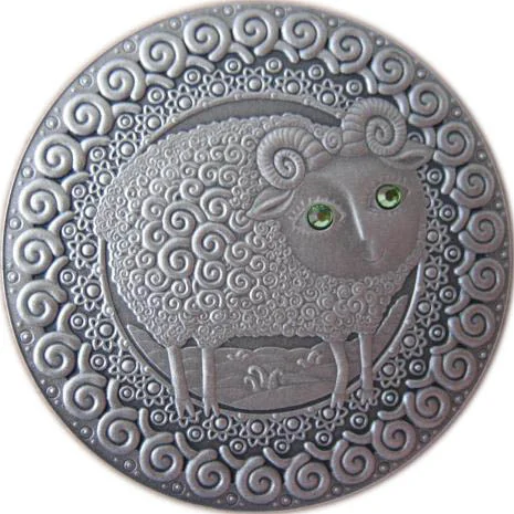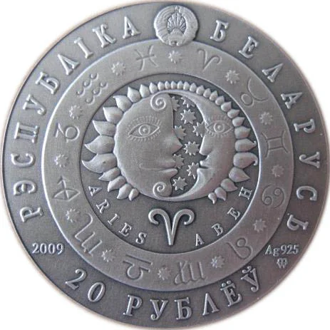 The central design features the Sun and Moon within a zodiac band, above the astrological sign and inscriptions for Aries. The top bears the State Coat of Arms of Belarus, while the bottom shows the year of issue and the mint's mark. Circumferential inscriptions read "РЭСПУБЛIКА БЕЛАРУСЬ" above and "20 РУБЛЁЎ" below.