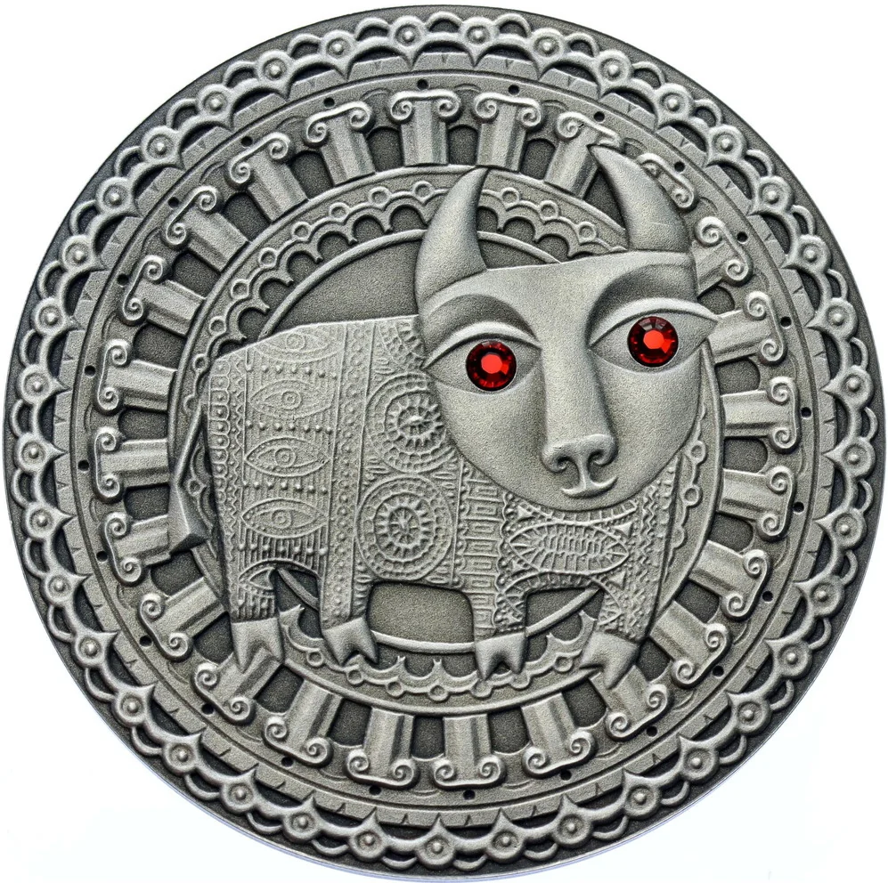 Taurus's stylized eyes are inlaid with synthetic crystals within a circular geometric ornament.