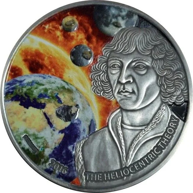 Description: The reverse features Nicolaus Copernicus presenting his heliocentric theory, with meteorite inserts from the Moon, Mars, Mercury, Vesta, and Moldavite. Inscriptions include "THE HELIOCENTRIC THEORY," "1OZ AG999," and "2016."