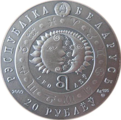 Center: Sun and Moon within the zodiac band, with the sign of Leo below, labeled "LEO" and "ЛЕЎ". Top: Relief of the State Coat of Arms. Bottom left: Year of issue. Bottom right: Alloy standard and Mint of Poland trademark. Circumferential inscriptions: "РЭСПУБЛIКА БЕЛАРУСЬ" (top) and "20 РУБЛЁЎ" (bottom).