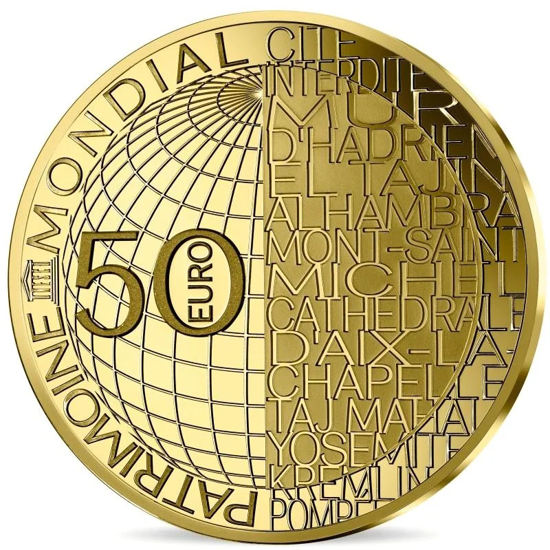 A UNESCO World Heritage globe, with site names on the right, the UNESCO logo on the left, and the face value inside. The reverse is a common design for the series.