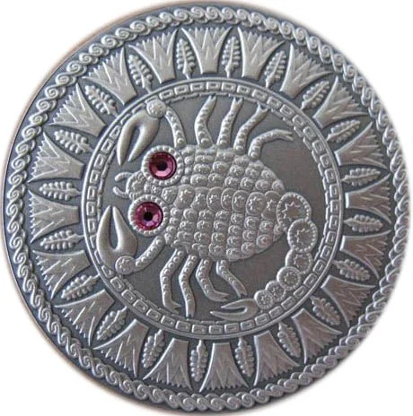 Scorpio's stylized eyes feature synthetic crystals set within a circular geometric ornament.