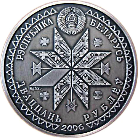 Description: The circular ornament features the relief of the Belarusian State Coat of Arms. At its center is a solar sign—an octagonal figure with rhombic decor representing rays. Below are the year of issue and alloy standard. The rim is inscribed "РЭСПУБЛIКА БЕЛАРУСЬ" above and "ДВАЦЦАЦЬ РУБЛЁЎ" below.