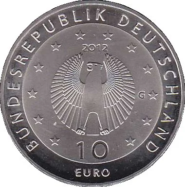 German federal eagle encircled by EU stars, "BUNDESREPUBLIK DEUTSCHLAND", year, mintmark "G", and "10 EURO".