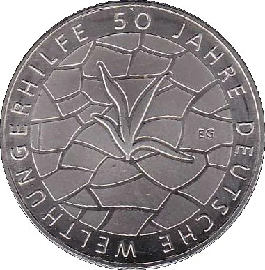 A wheat shoot in cracked earth, encircled by "50 JAHRE DEUTSCHE WELTHUNGERHILFE."