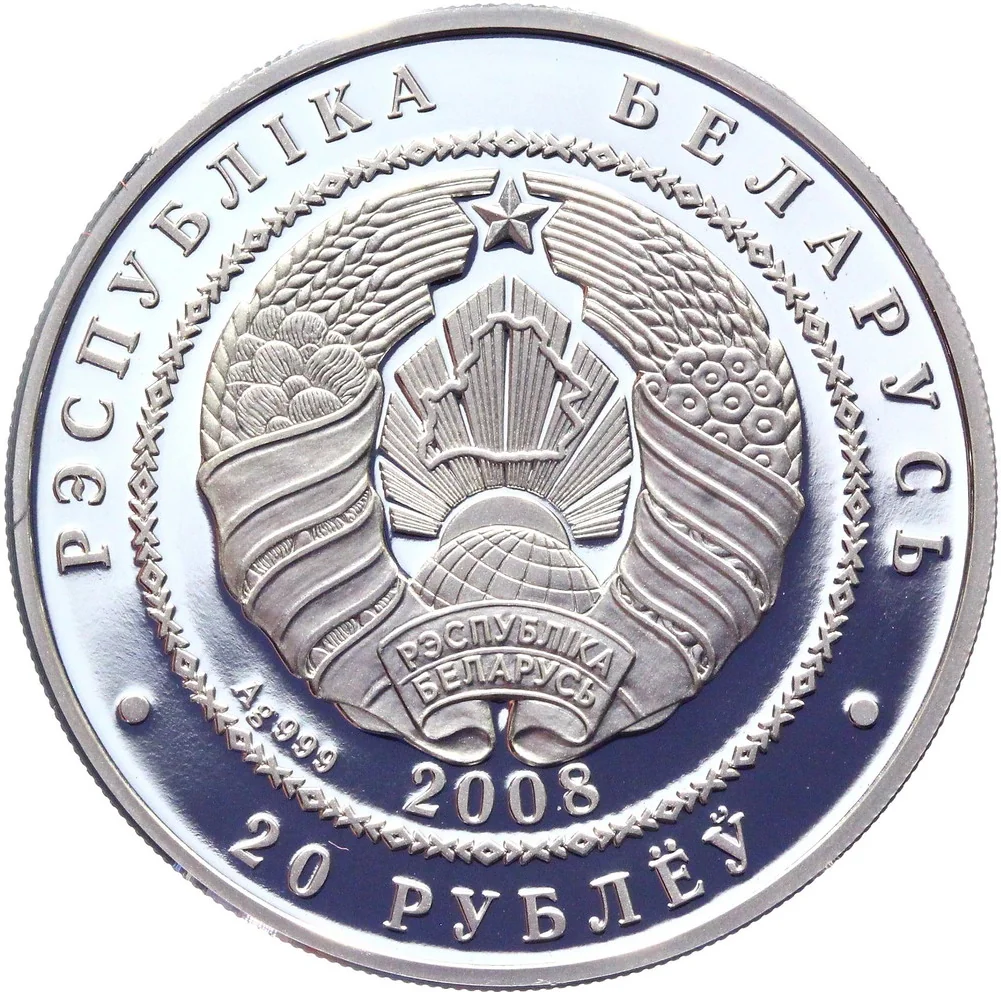 Description: Centered, the State Coat of Arms of Belarus in a circle with a geometric ornament. Below: the year, alloy standard. Circumferential inscriptions: РЭСПУБЛІКА БЕЛАРУСЬ (top) and 20 РУБЛЁЎ (bottom).
