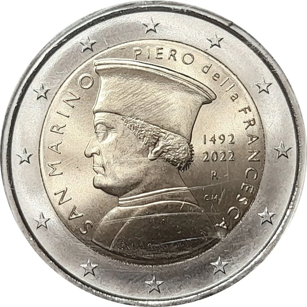 Description: Center: Federico da Montefeltro's profile from Piero della Francesca's 'Diptych of the Dukes of Urbino' (Uffizi, Florence). Left semicircle: "SAN MARINO." Right semicircle: "PIERO DELLA FRANCESCA," the years 1492 and 2022, the Rome Mint mark "R," and artist initials "C.M." Outer ring: twelve European flag stars.