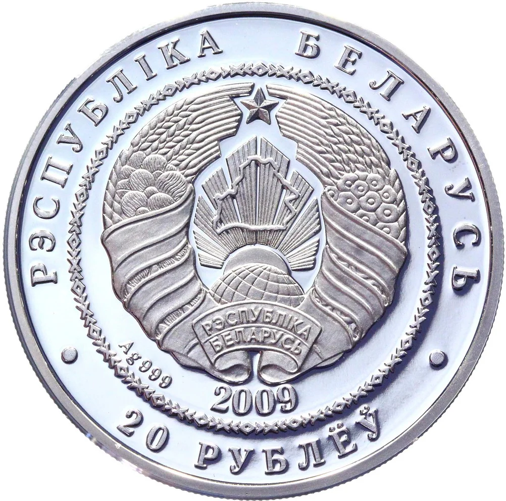 Center: relief of the State Coat of Arms within a circle, surrounded by geometric ornament. Below: year of issue and alloy standard. Circumferential inscriptions: top — РЭСПУБЛIКА БЕЛАРУСЬ (THE REPUBLIC OF BELARUS), bottom — 20 РУБЛЁЎ (20 RUBLES).