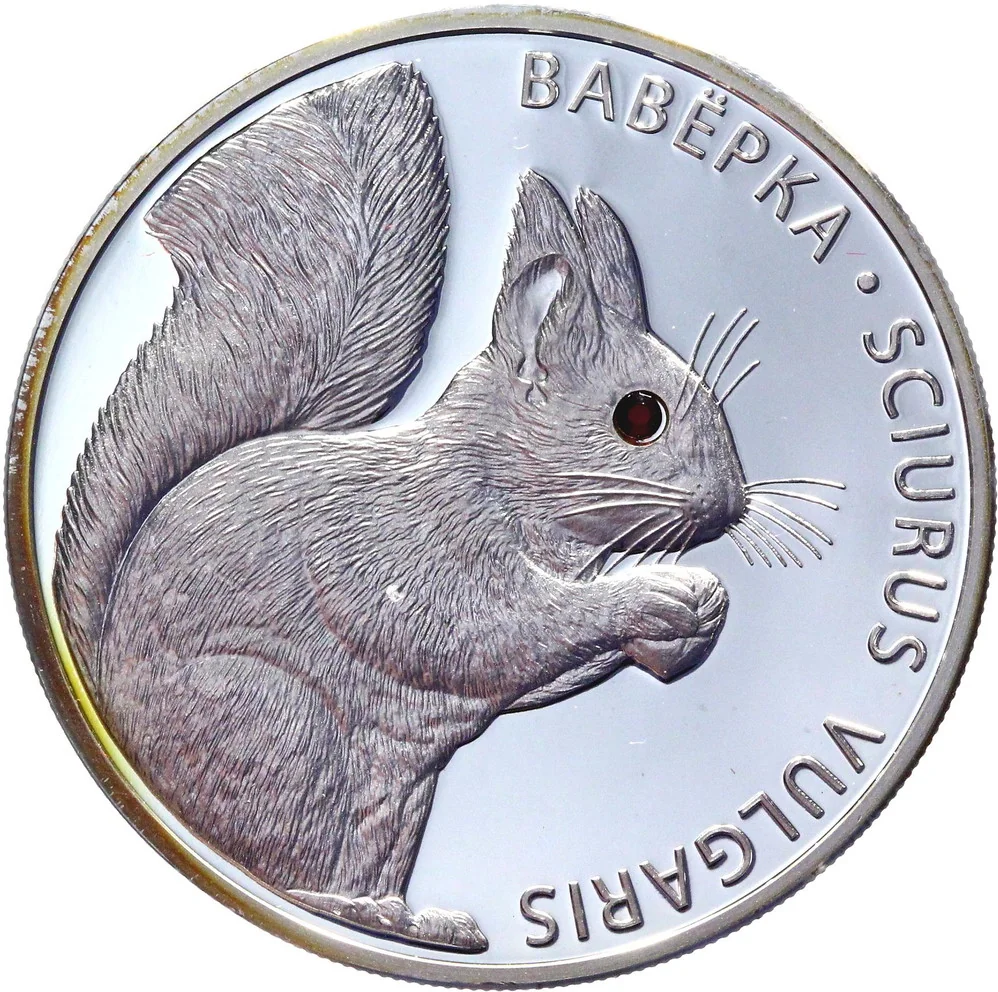 A squirrel relief with a Swarovski crystal eye is centered, with a circumferential inscription on the right: ВАВЁРКА * SCIURUS VULGARIS (SQUIRREL * SCIURUS VULGARIS).