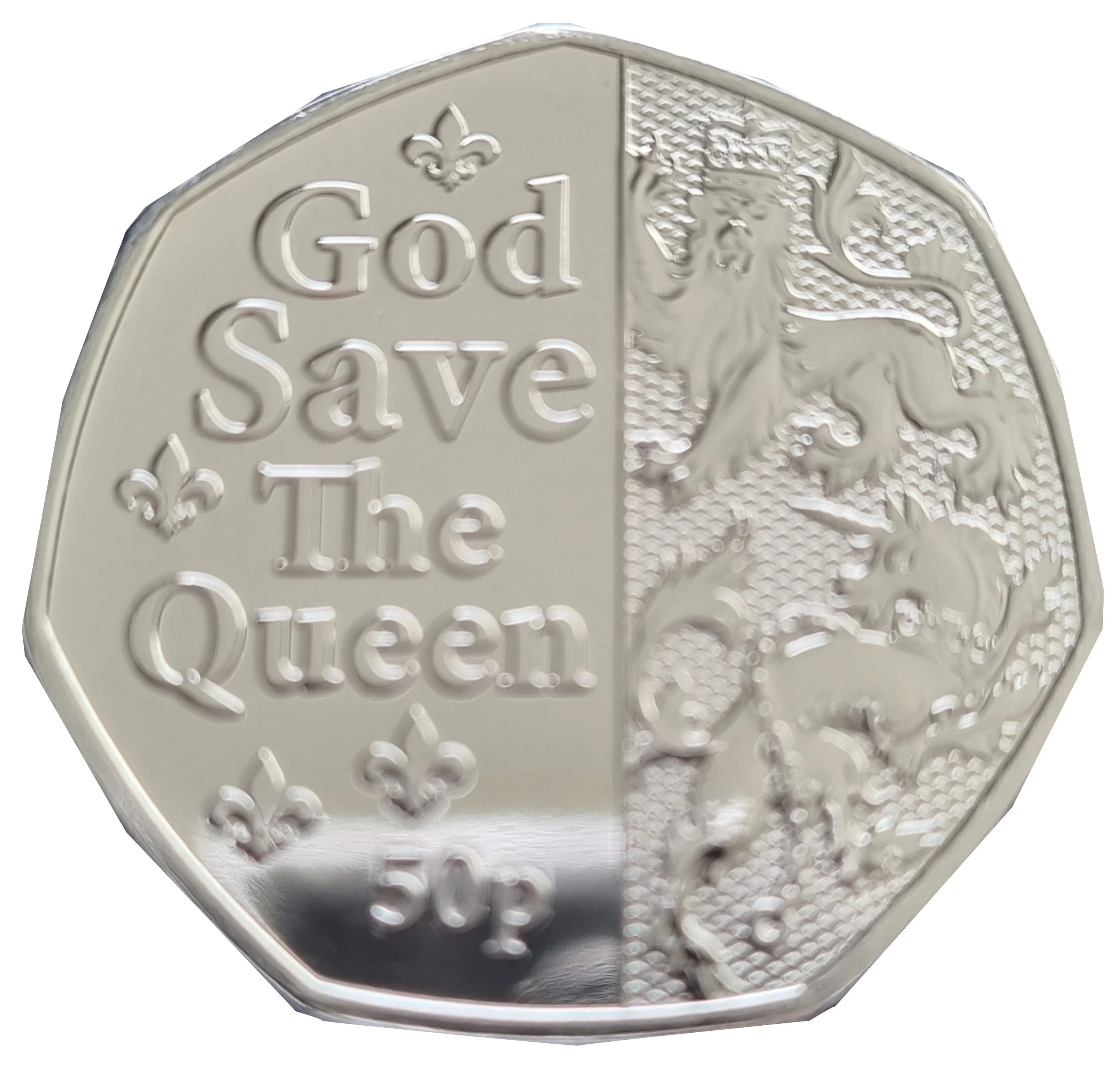 "God Save the Queen" with the Lion of England and Unicorn of Scotland.