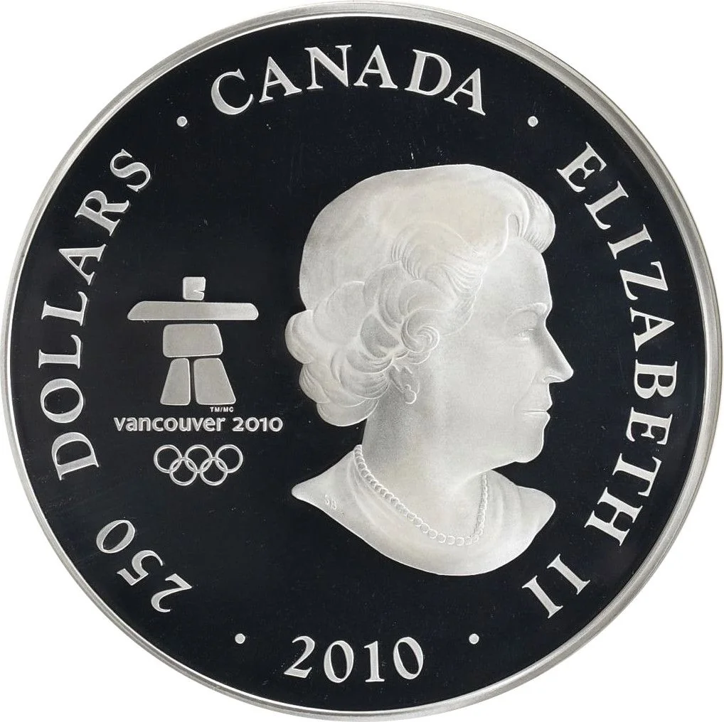 Queen Elizabeth II at 77, facing right, wearing necklace and earrings. Vancouver 2010 Olympic logo.