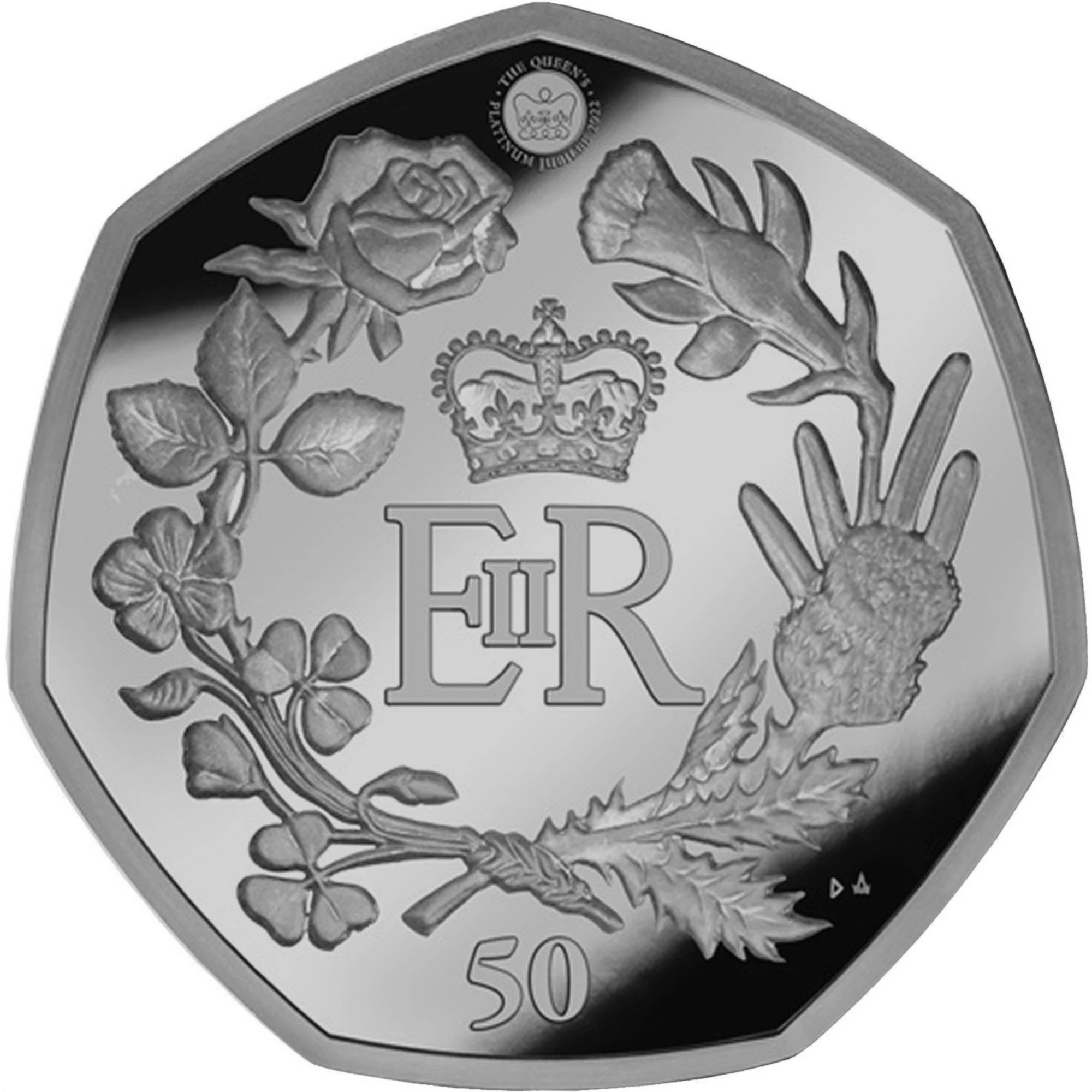 This coin features the Royal Cypher "EIIR" encircled by national symbols: a rose for England, a daffodil for Wales, a thistle for Scotland, and shamrocks for Northern Ireland.