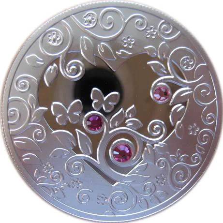 Description: Featuring the State Coat of Arms and "РЭСПУБЛІКА БЕЛАРУСЬ" above. A central heart, textured with butterflies, bears "MY HEART" in four languages. Below are the denomination, year, alloy, and mint mark.