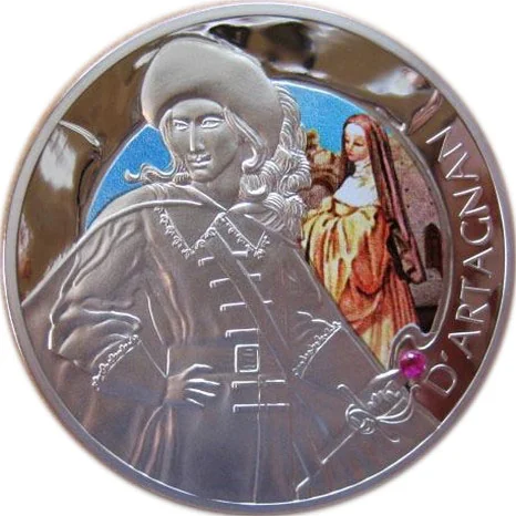 Left: d'Artagnan. Right: Constance. The sword hilt features a red synthetic zircon. A French inscription, "D'ARTAGNAN," runs along the bottom right rim.