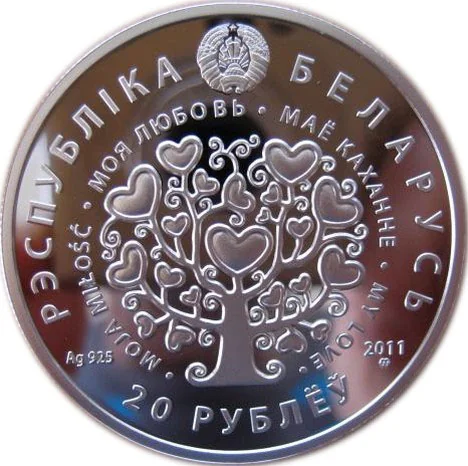 Bottom: Face value "20 РУБЛЁЎ". Left: Alloy standard. Right: Year of issue and Mint of Poland mark.