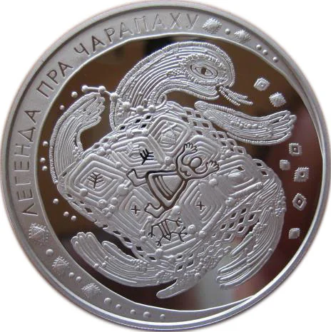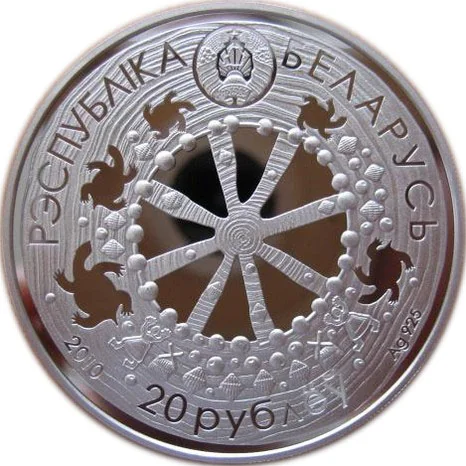 Description: The obverse features the national coat of arms. The central design presents stylized tortoises and women from Belarusian folklore, with ornamental patterns against a spinning wheel—its pattern transforming into tree rings, symbolizing perpetual motion. The bottom shows the year, alloy, and "20 РУБЛЁЎ". Circumferential inscriptions read "РЭСПУБЛІКА БЕЛАРУСЬ" above and "20 РУБЛЁЎ" below.