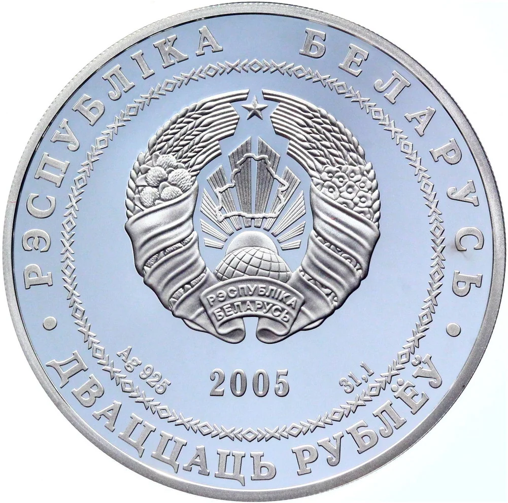 Description: The circular ornament features the relief State Coat of Arms. Below are the year, silver content, and alloy standard. The rim inscriptions read: "РЭСПУБЛIКА БЕЛАРУСЬ" above and "ДВАЦЦАЦЬ РУБЛЁЎ" below.