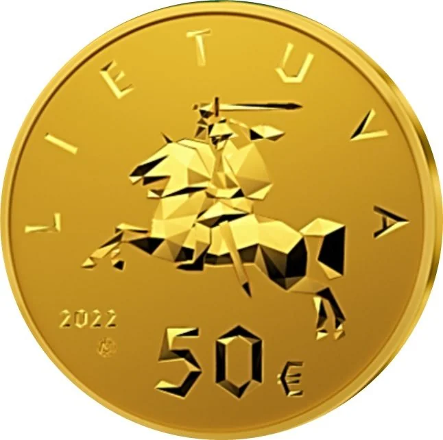 The obverse features a stylized Vytis, Lithuania's coat of arms, with the inscription LIETUVA above and the denomination (€50), year (2022), and mintmark below.