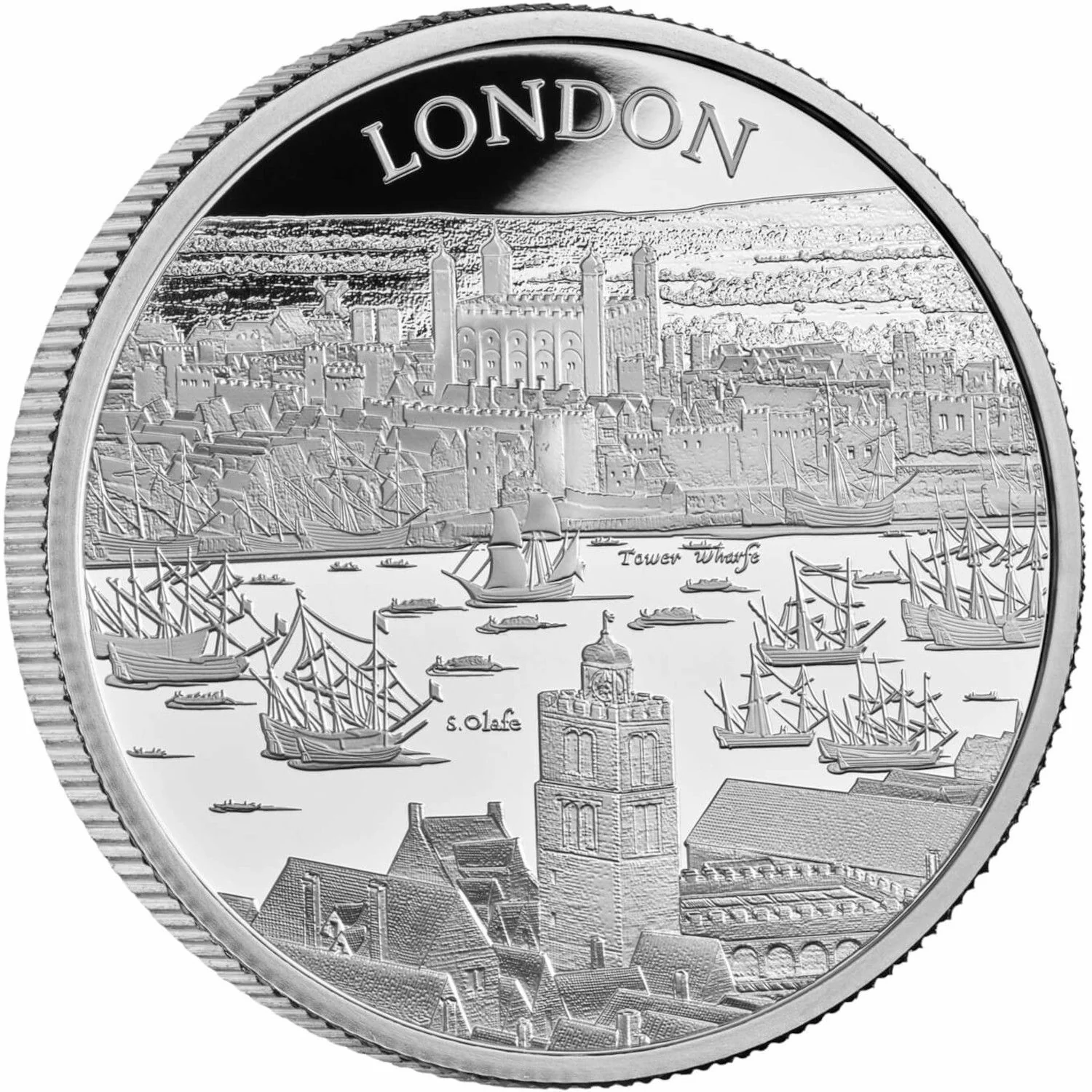 Historic London view with the Tower of London and both banks of the Thames, topped by a legend.