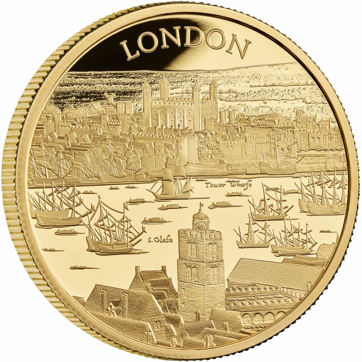 Historic London view with the Tower of London and both banks of the Thames, topped by a legend.