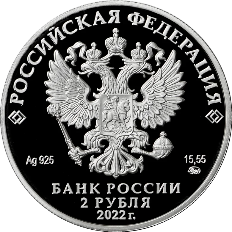 The coin's obverse features the Russian Federation coat of arms, along with inscriptions for "RUSSIAN FEDERATION," "BANK OF RUSSIA," "2 ROUBLES," "2022," the metal's chemical symbol, its fineness, the mint mark, and the fine metal content.
