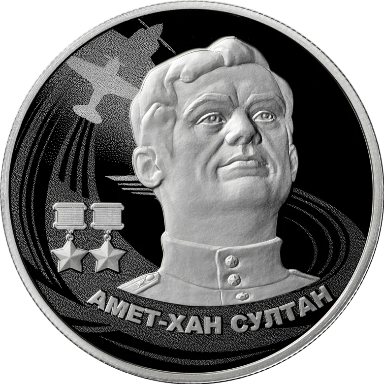 The reverse features a laser-matte relief portrait of Amet-khan Sultan, twice Hero of the Soviet Union, with Gold Star medals, flying aircraft silhouettes, and stylised sky trails. Below is the relief inscription: ‘АМЕТ-ХАН СУЛТАН’.
