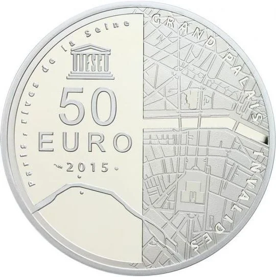Right: Paris map marking the Invalides and Grand Palais. Left: UNESCO logo, "50 EURO," and the year.