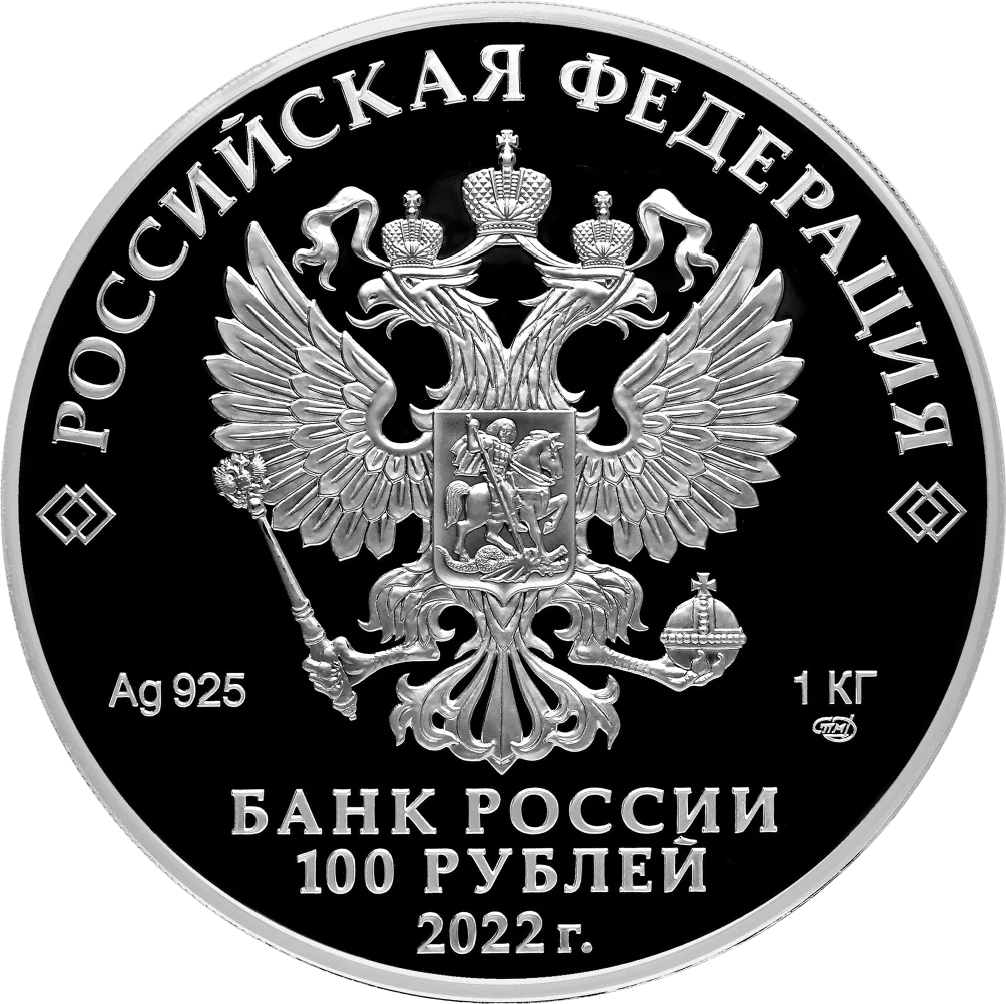 The obverse features the Russian Federation coat of arms with inscriptions: "РОССИЙСКАЯ ФЕДЕРАЦИЯ," "БАНК РОССИИ," "100 РУБЛЕЙ," "2022 г.," the metal's chemical symbol, fineness, mint mark, and fine metal content.