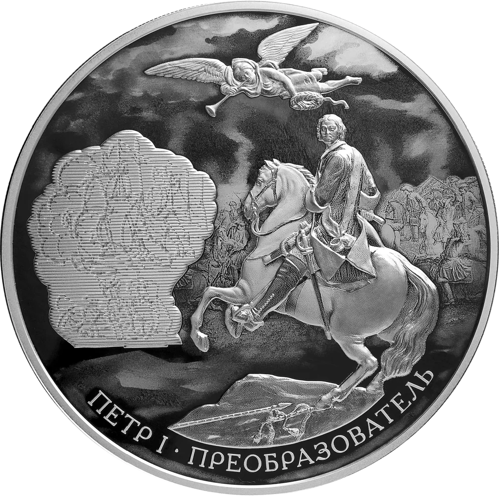 The reverse shows Peter the Great on horseback, crowned by an angel, against a laser-matte battle panorama. A shifting raster image on the left alternates land and sea battle scenes. The circumferential inscription reads: ‘ПЕТР I • ПРЕОБРАЗОВАТЕЛЬ’.