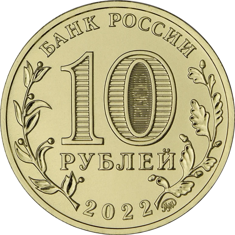 The obverse features "БАНК РОССИИ" at the top and "2022" at the bottom, with bay and oak branches on the sides. The central "10 РУБЛЕЙ" denomination has a security element inside the '0' showing "10 РУБ" at different angles. The Moscow Mint mark is at the bottom.
