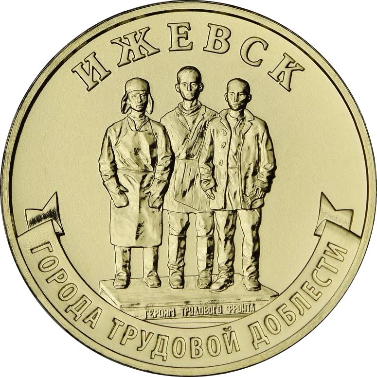 The reverse depicts a fragment of the monument To the Gunsmiths of Udmurtia, with the inscriptions ‘ИЖЕВСК’ above and ‘ГОРОДА ТРУДОВОЙ ДОБЛЕСТИ’ on a ribbon below.