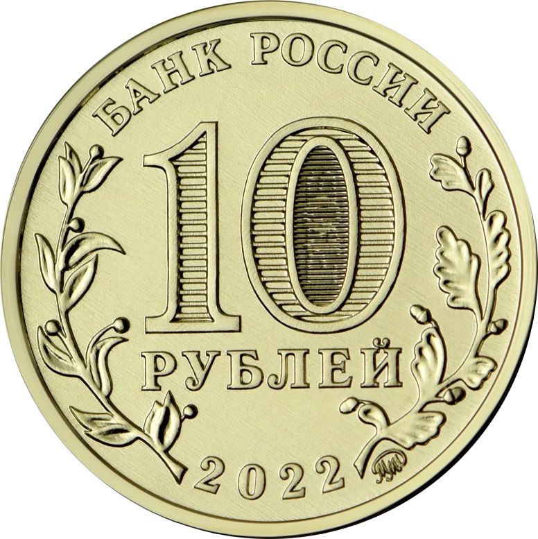 The obverse features "БАНК РОССИИ" at the top and "2022" at the bottom, with bay and oak branches on the sides. The central "10 РУБЛЕЙ" denomination has a security element inside the '0' showing "10 РУБ" at different angles. The Moscow Mint mark is at the bottom.