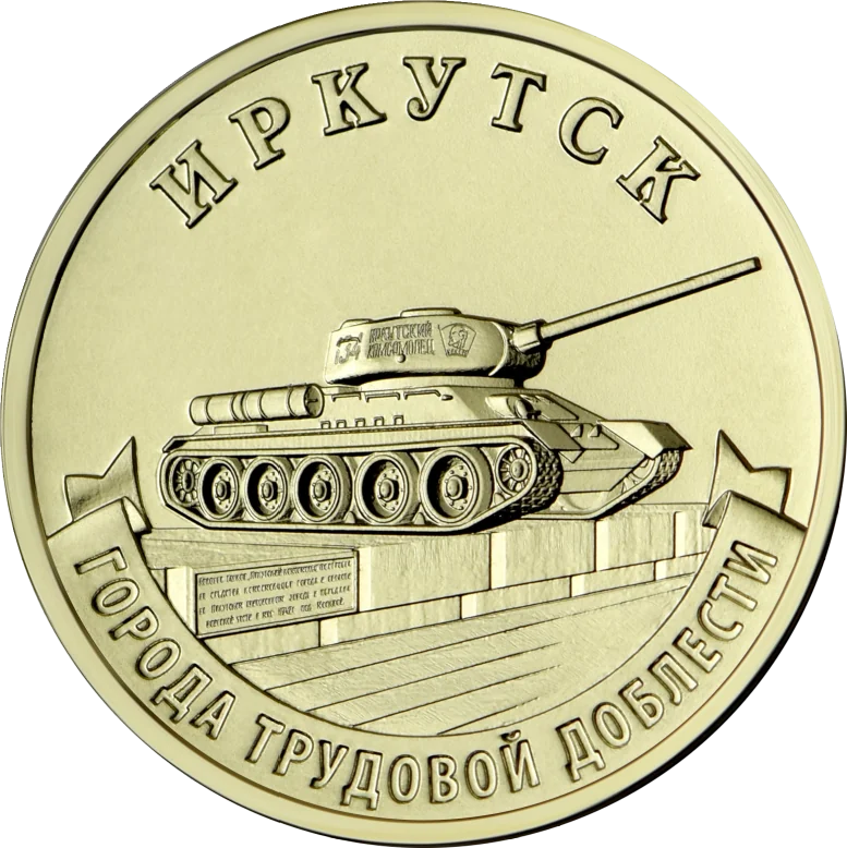 The reverse shows a relief fragment of the Tank T-34-85 Irkutsky Komsomolets monument, encircled by the inscriptions ‘ИРКУТСК’ above and ‘ГОРОДА ТРУДОВОЙ ДОБЛЕСТИ’ on a ribbon below.