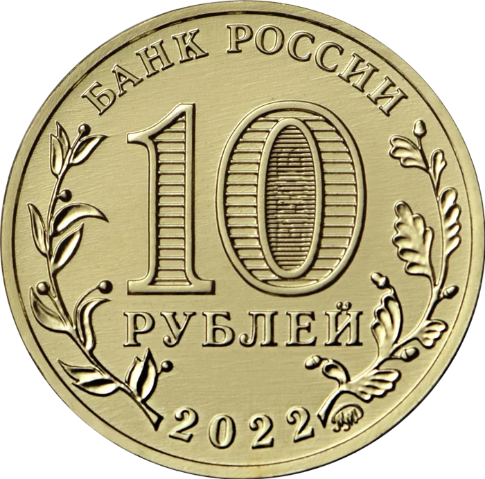 The obverse features "БАНК РОССИИ" at the top and "2022" at the bottom, with bay and oak branches on the sides. The central "10 РУБЛЕЙ" denomination has a security element inside the '0' showing "10 РУБ" at different angles. The Moscow Mint mark is at the bottom.