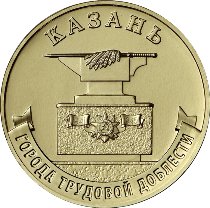 Reverse: fragment of the Monument to Home Front Workers, with "КАЗАНЬ" above and "ГОРОДА ТРУДОВОЙ ДОБЛЕСТИ" below.