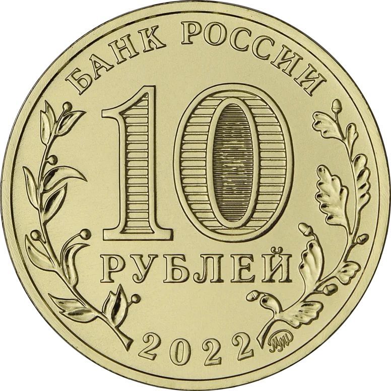 The obverse features "БАНК РОССИИ" at the top and "2022" at the bottom, with bay and oak branches on the sides. The central "10 РУБЛЕЙ" denomination has a security element inside the '0' showing "10 РУБ" at different angles. The Moscow Mint mark is at the bottom.